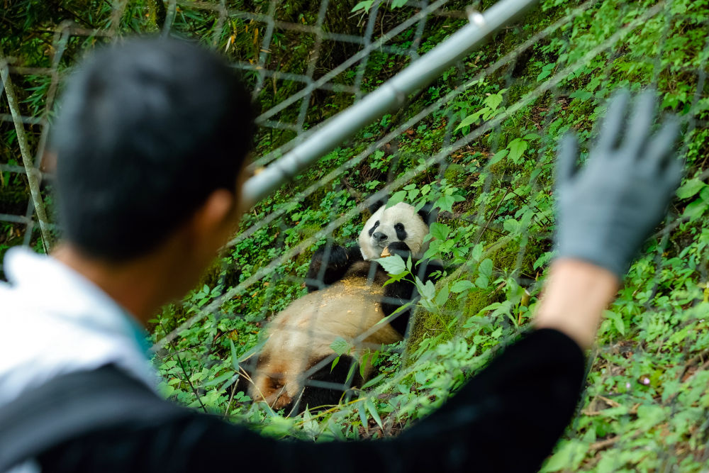 2024年6月24日,在位于大熊貓國家公園臥龍片區(qū)內(nèi)天臺山的大熊貓第二階段野化培訓(xùn)場外,工作人員給母熊貓“賢賢”投喂完食物后揮手向其告別。近年來,我國通過大力實施天然林保護、野生動植物保護和大熊貓國家公園建設(shè)等,保護大熊貓及其棲息地,成效顯著。大熊貓野外種群總量已從20世紀(jì)80年代的約1100只增長到近1900只。