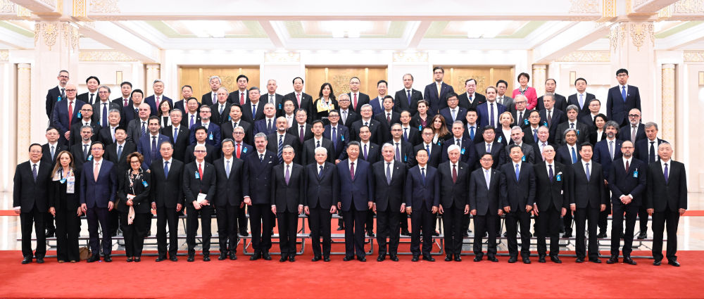 11月8日晚,習近平主席在北京同意大利總統馬塔雷拉共同會見出席中意文化合作機制大會和中意大學校長對話會的雙方代表。這是會見前,兩國元首同雙方代表合影留念。新華社記者 申宏 攝