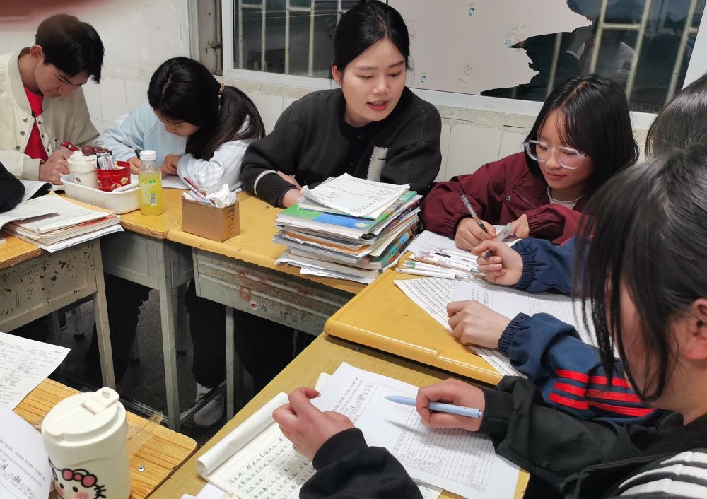 2024年4月21日,云南昭通大關一中教師劉雪瑤(左三)在輔導學生做作業。(李龍強 攝)