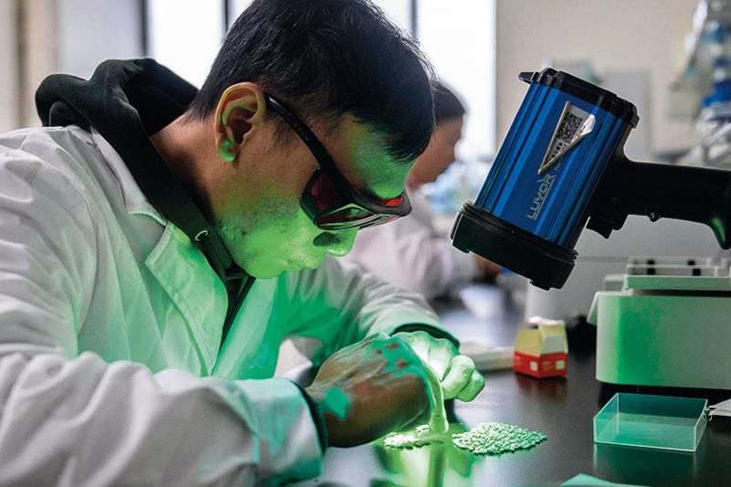 在湖南雜交水稻研究中心,工作人員通過熒光法進行水稻樣本分析(2024年11月25日攝) 陳思汗攝 / 本刊