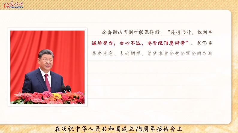 2024年是中華人民共和國成立75周年。9月30日,習近平總書記在慶祝中華人民共和國成立75周年招待會上的講話中引用南岳衡山的一副對聯“遵道而行,但到半途須努力;會心不遠,要登絕頂莫辭勞”,要求全黨同志居安思危、未雨綢繆,堅決戰勝一切不確定難預料的風險挑戰。