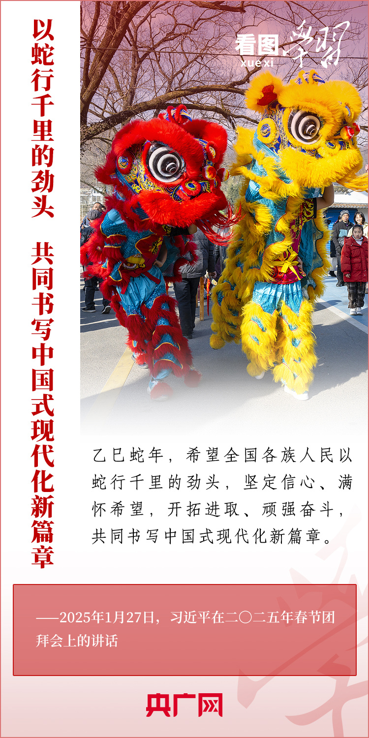 1月27日,中共中央、國務院在北京舉行春節團拜會,習近平總書記發表熱情洋溢的講話,向全國各族人民、港澳臺同胞、海外僑胞拜年并致以新春祝福??倳浽谥v話中深情回顧過去一年中國式現代化取得很不平凡的發展歷程,“希望全國各族人民以蛇行千里的勁頭,堅定信心、滿懷希望,開拓進取、頑強奮斗,共同書寫中國式現代化新篇章?!币黄饋韺W習!