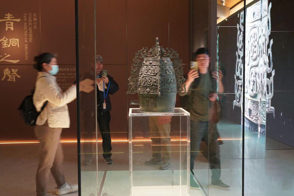 2月26日,游客在西部機場博物館珍寶館內參觀國家一級文物“秦公镈”。