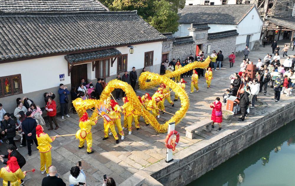 2月10日,浙江湖州市德清縣新市古鎮舞龍表演。