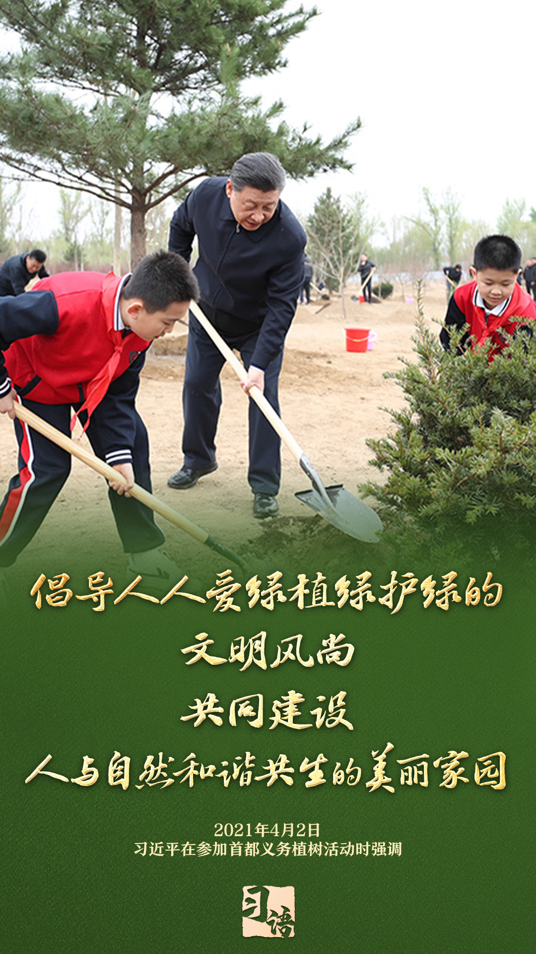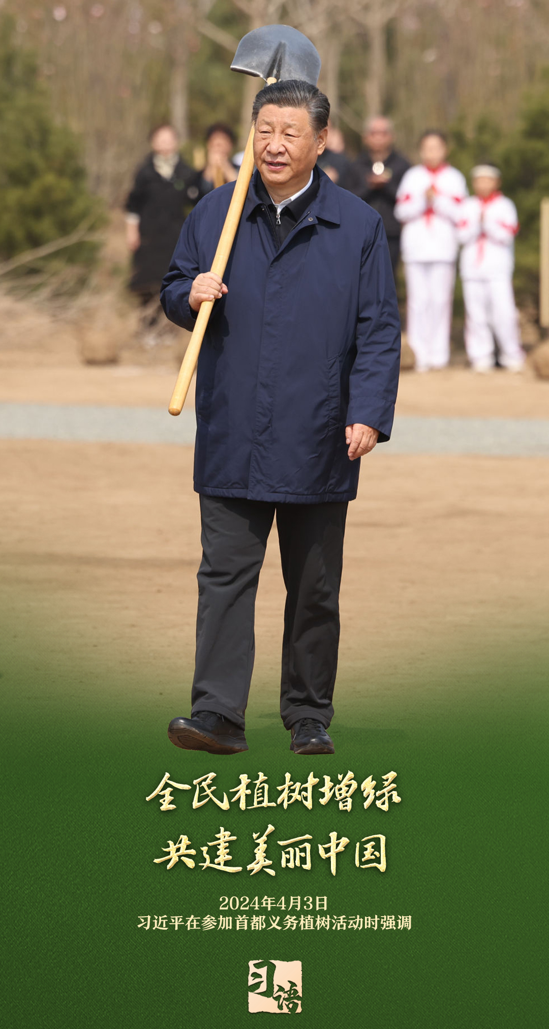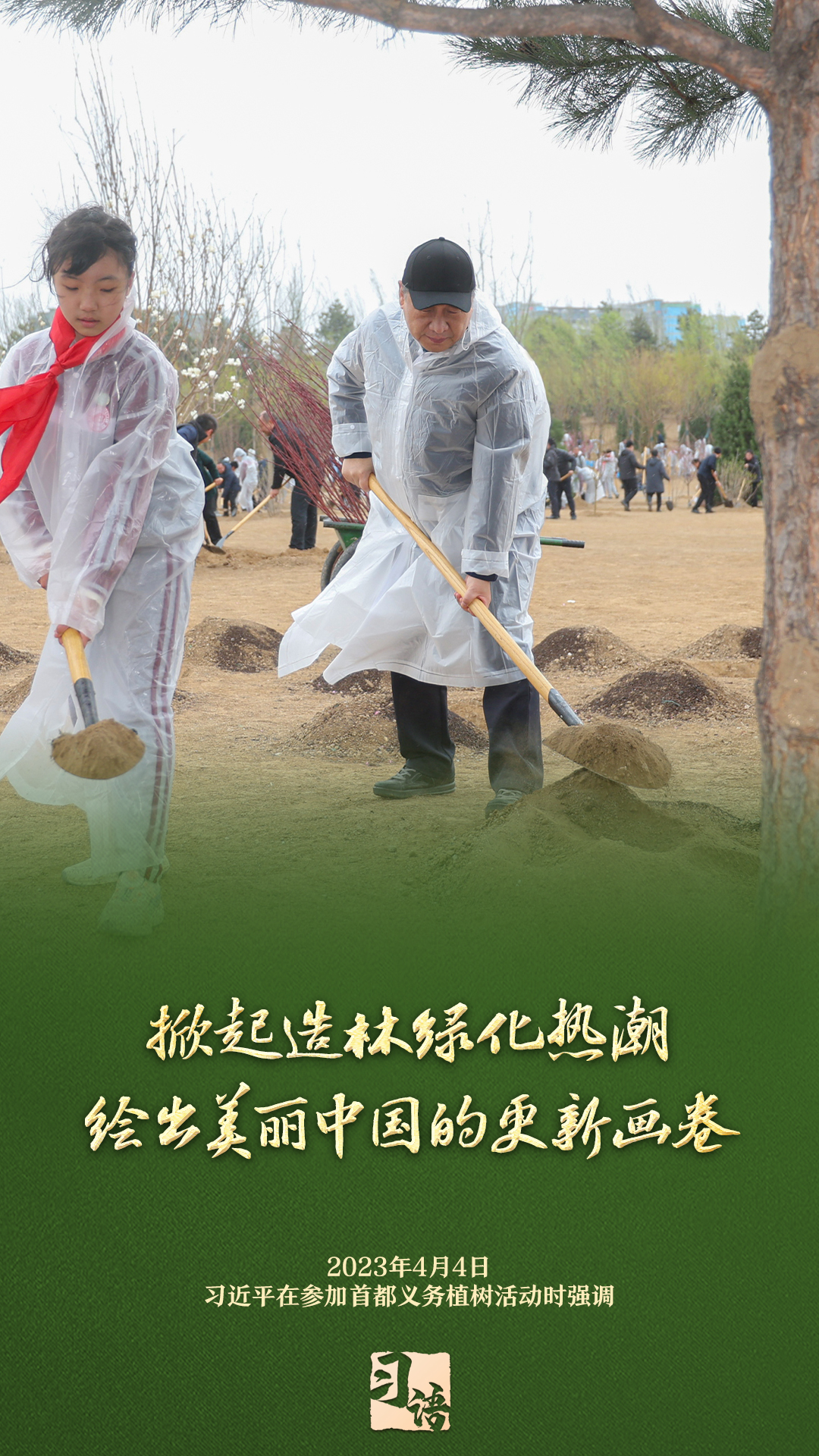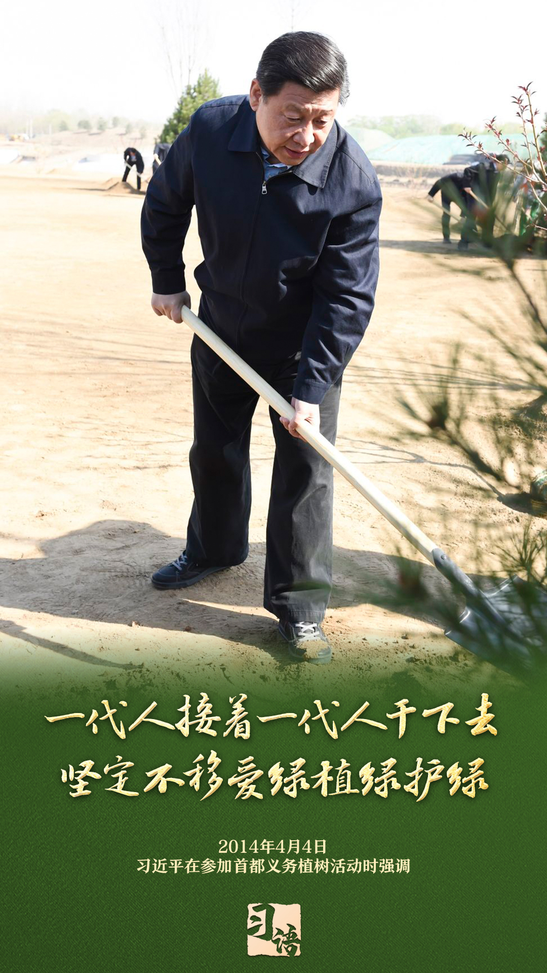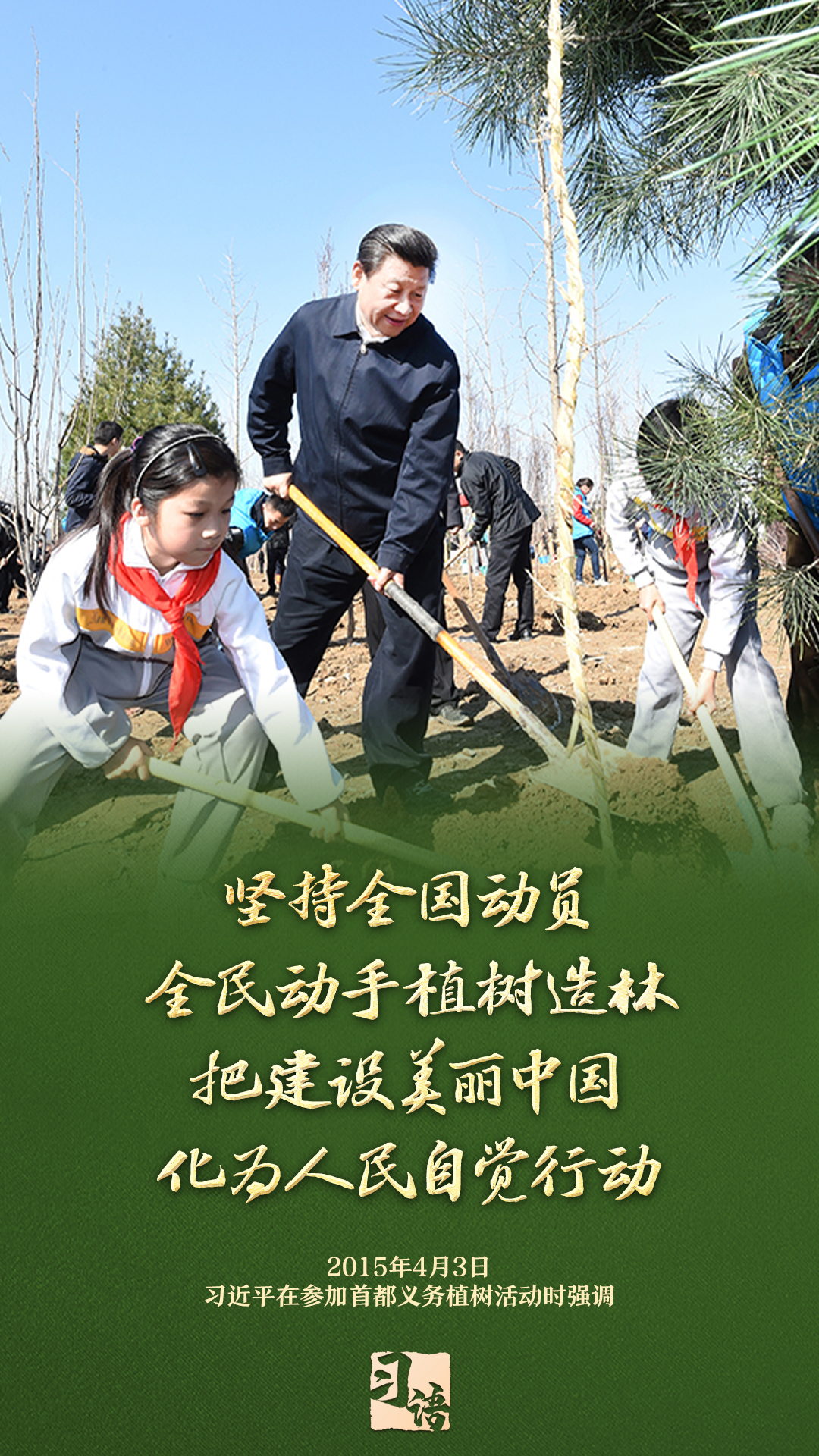 “植樹造林是一件很有意義的事情,是一項功在當代、利在千秋的崇高事業,要一以貫之、持續做下去。”自2013年以來的13個春天里,無論晴雨,習近平總書記都會拿起鐵鍬,與干部群眾一起參加首都義務植樹活動。鏟土造坑、培土圍堰、提水澆灌,總書記身體力行種下綠色的希望,對擴綠興綠護綠、建設美麗中國提出明確要求。一起學習。