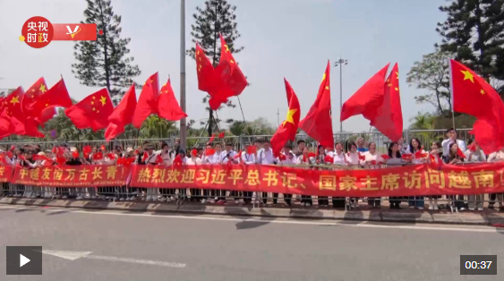 習近平乘車從機場赴下榻飯店途中,中越兩黨兩國旗幟迎風飄揚,“中越友誼萬古長青”、“山水相連,命運與共”、“中越情誼深,同志加兄弟”等紅色橫幅鮮艷奪目。當地民眾和中資機構、留學生代表聚集在道路兩旁,熱烈歡迎習近平到訪。