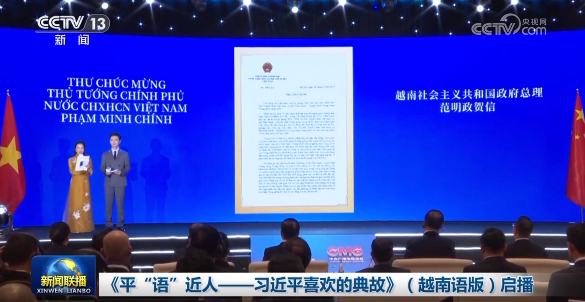 在中共中央總書記、國家主席習近平對越南進行國事訪問之際,4月14日,由中國中央廣播電視總臺制作的《平“語”近人——習近平喜歡的典故》(越南語版)在越南啟播。慶祝中越建交75周年人文交流活動同日在河內舉行。越南總理范明政致賀信,對節(jié)目播出和活動成功舉辦表示祝賀。
