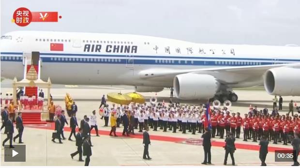 當(dāng)?shù)貢r間4月17日上午,國家主席習(xí)近平在柬埔寨國王西哈莫尼的陪同下檢閱柬埔寨儀仗隊。