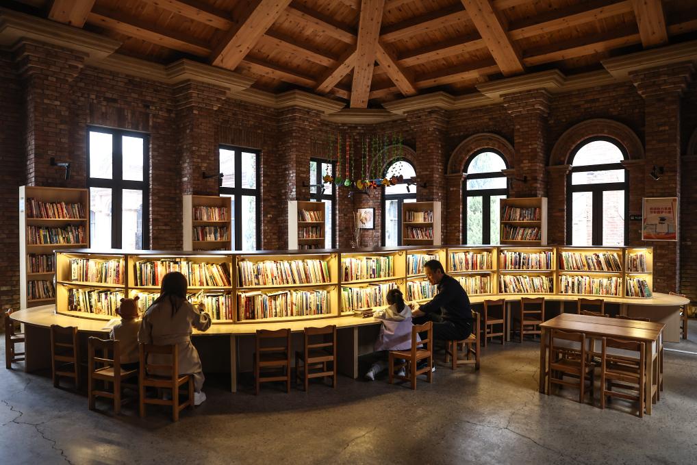 4月17日,小朋友在家長(zhǎng)的陪同下在沈陽市鐵西區(qū)奉天工場(chǎng)文創(chuàng)園內(nèi)的城市書房?jī)?nèi)讀書。新華社記者 潘昱龍 攝