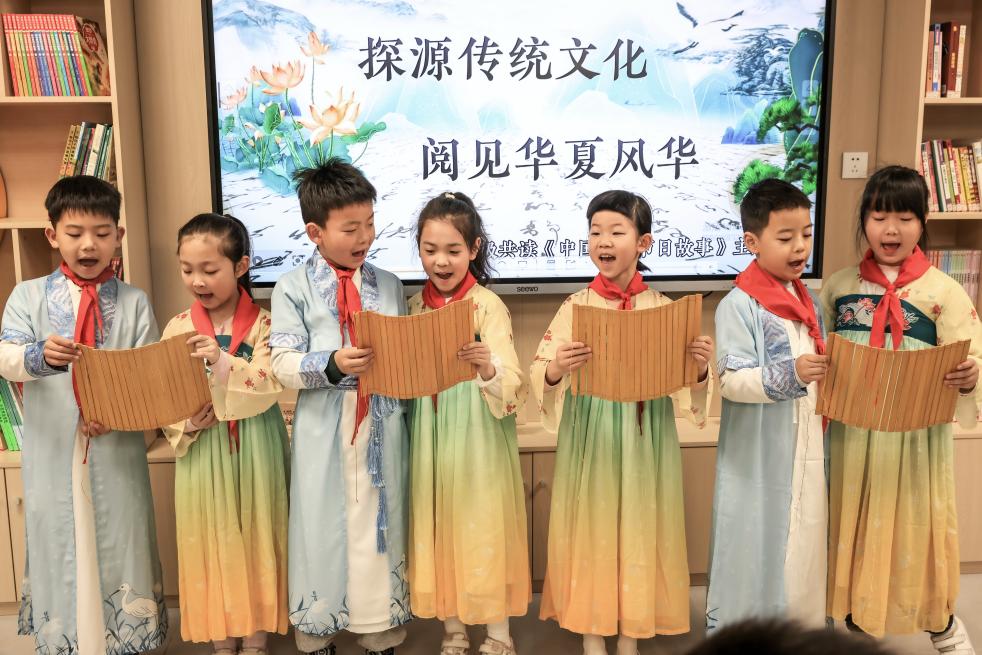 4月2日,湖北省武漢市洪山區(qū)未來實(shí)驗(yàn)小學(xué)美林校區(qū)學(xué)生在吟誦古詩(shī)。新華社發(fā)(趙軍攝)