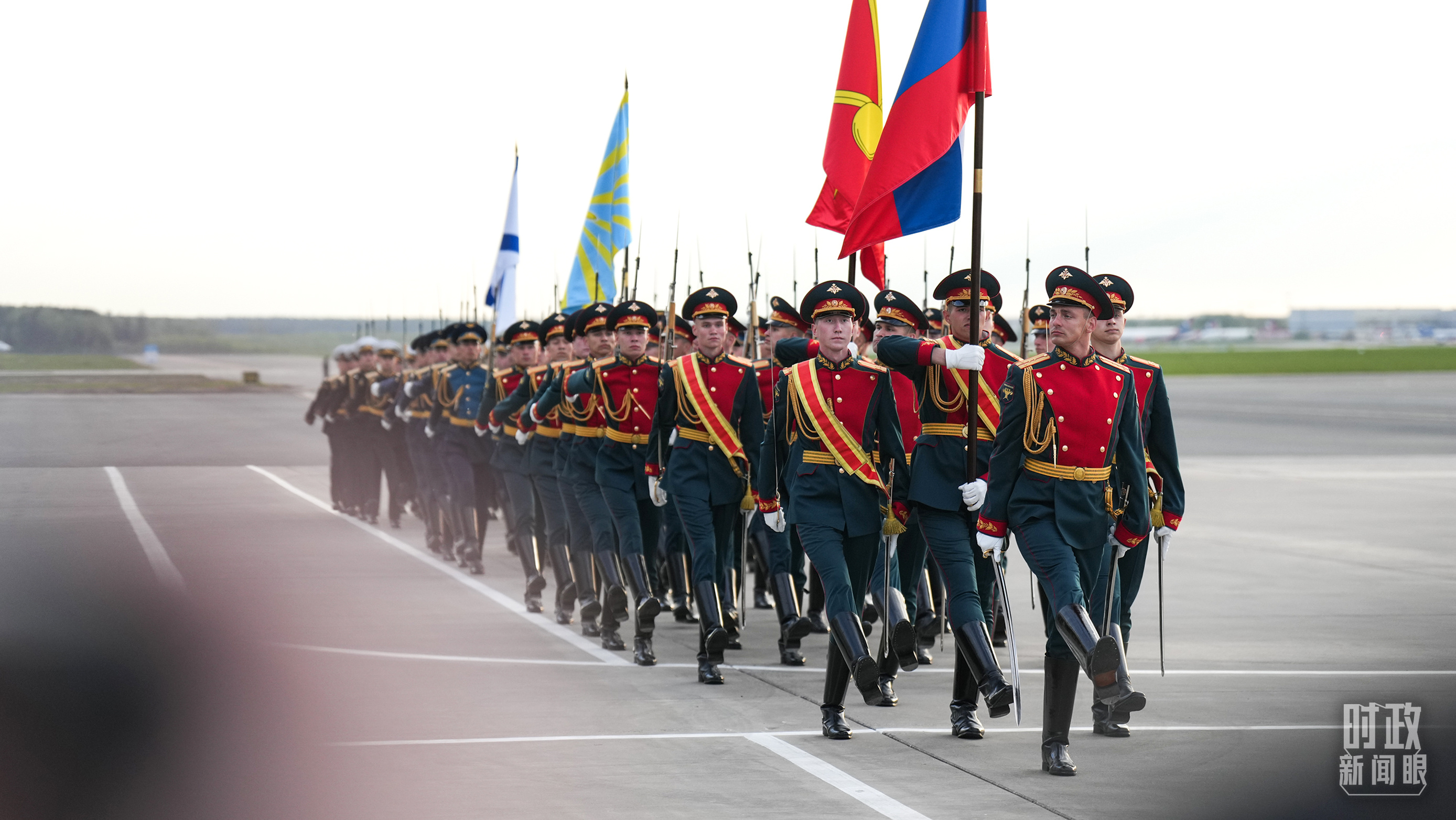 俄方在機場舉行隆重迎接儀式。軍樂團奏中俄兩國國歌。習主席檢閱儀仗隊并觀看分列式。