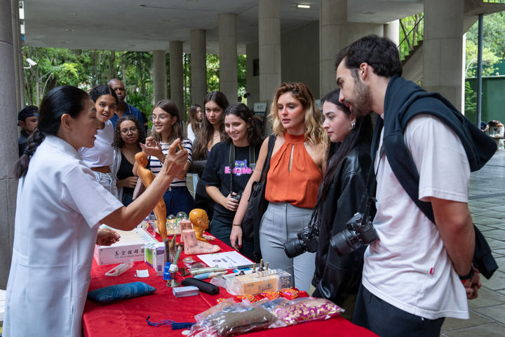 2025年4月15日,在巴西里約熱內(nèi)盧天主教大學(xué)舉辦的“國(guó)際中文日”慶?;顒?dòng)上,學(xué)生們觀看中醫(yī)療法展示。