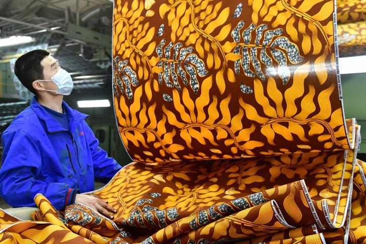 2025年2月25日,在位于山東省濱州市的愉悅家紡有限公司,工作人員在生產出口非洲的布匹。