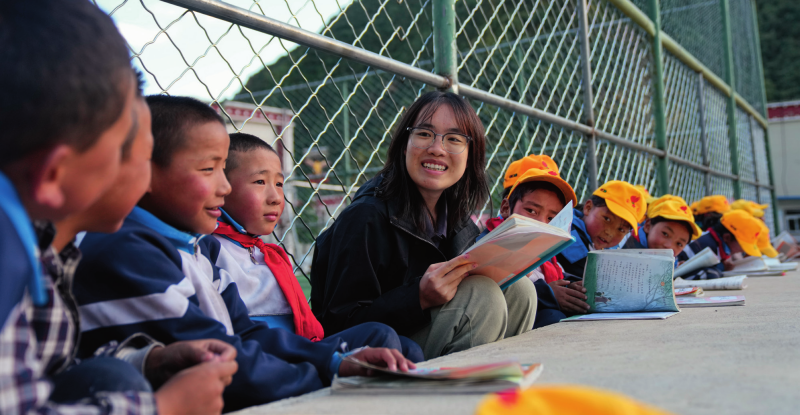 在西藏林芝市工布江達縣娘蒲鄉中心小學,嶺南師范學院支教隊隊員涂建枝在晚自習前和孩子們一起溫習功課(2024年9月3日攝)劉洲鵬攝/本刊