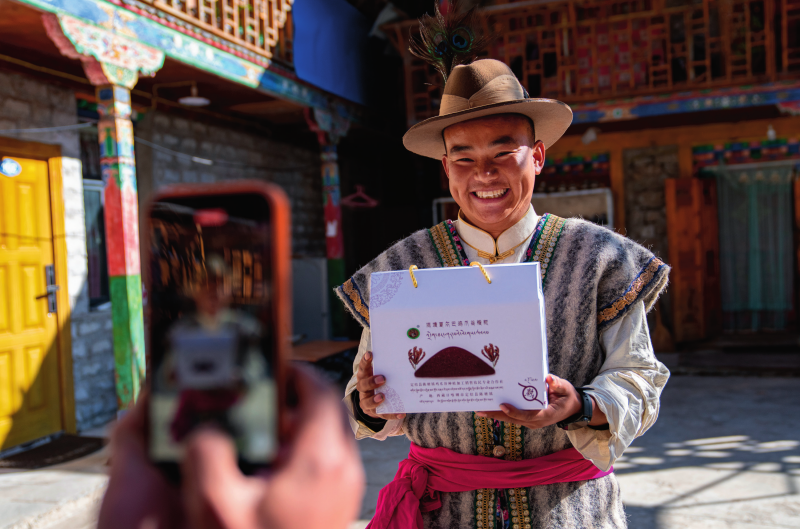 在西藏日喀則市定結縣陳塘鎮,自媒體博主夏爾巴人旦增在拍攝視頻推介當地特產雞爪谷糌粑(2024年12月13日攝)丁增尼達攝/本刊