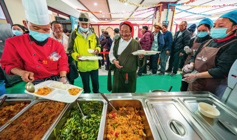 在西藏那曲市色尼區老年人日間照料中心,老人們在排隊打飯(2025年4月25日攝)丁增尼達攝/本刊
