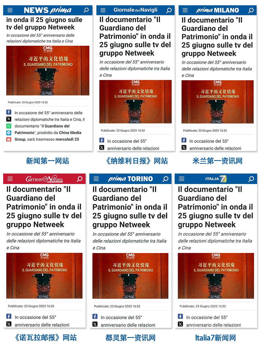 6月25日起,《習近平的文化情緣》在意大利阿爾瑪電視臺、多納電視臺、旅游電視臺、拉齊奧電視臺、倫巴第城市電視臺、羅馬科羅納廣播電視臺、米蘭帕維亞電視臺,《米蘭財經報》網站等30多家意主流媒體平臺陸續上線播出。
