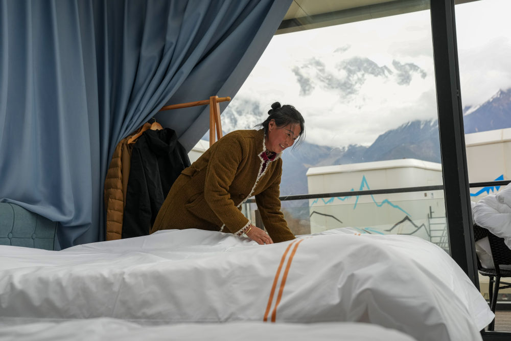 林芝索松村一家民宿的服務員在整理房間。