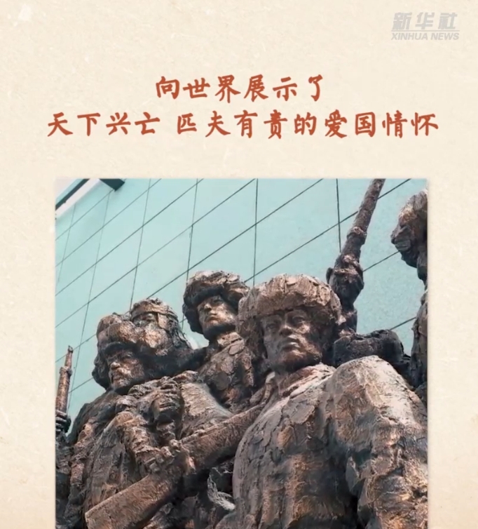 中國人民在抗日戰爭的壯闊進程中孕育出偉大抗戰精神,向世界展示了天下興亡、匹夫有責的愛國情懷,視死如歸、寧死不屈的民族氣節,不畏強暴、血戰到底的英雄氣概,百折不撓、堅忍不拔的必勝信念。