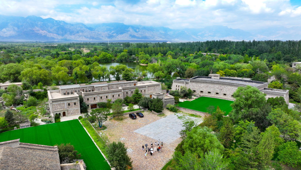 游客在寧夏銀川市西夏區鎮北堡鎮源石酒莊游玩(無人機照片,2024年8月7日攝)。新華社記者 馮開華 攝