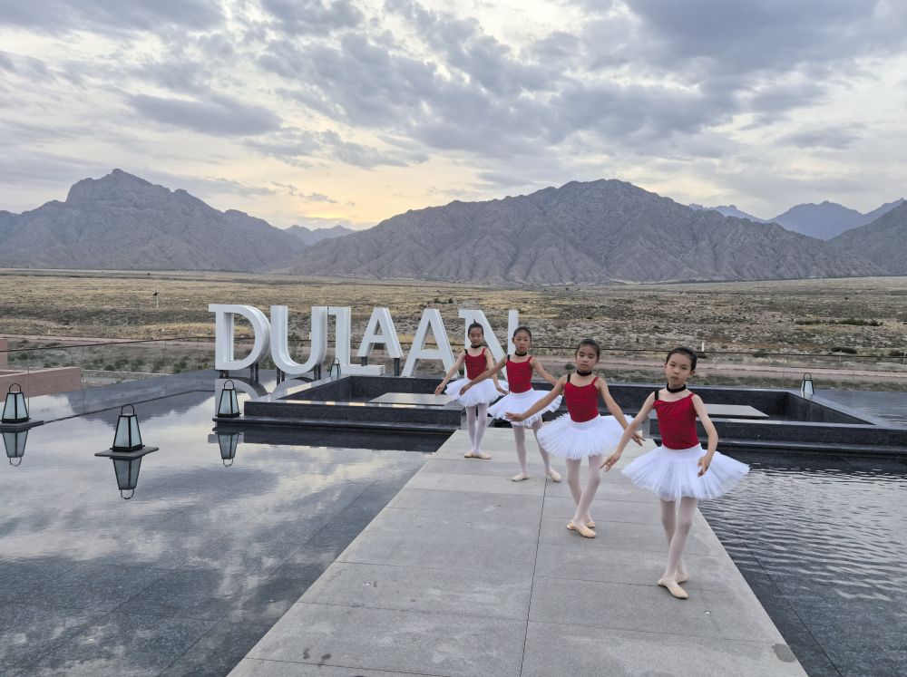 寧夏銀川市圖蘭朵葡萄酒小鎮安漠酒店觀景臺,游客在拍照打卡(2025年6月6日攝)。新華社記者 馬麗娟 攝