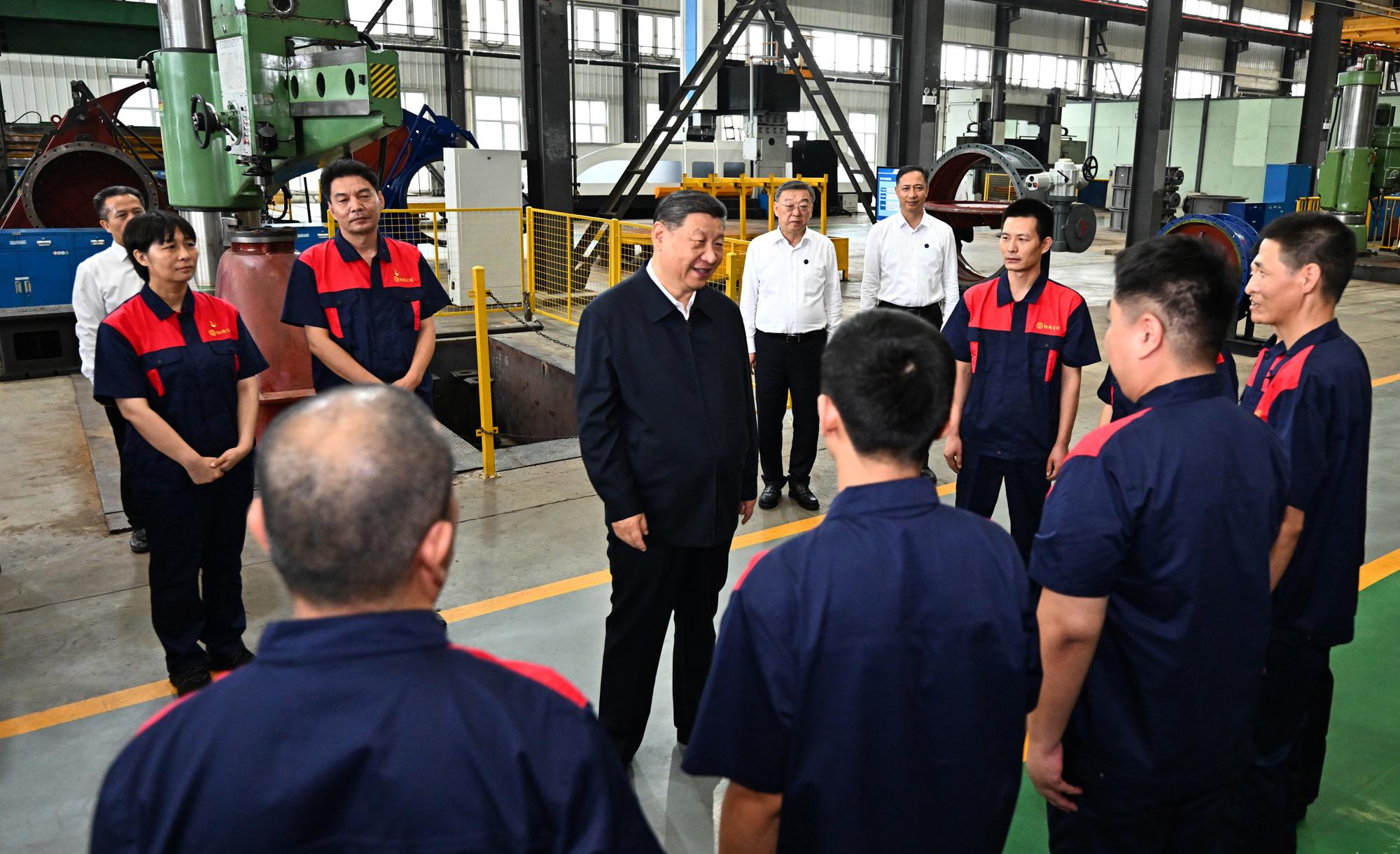 2025年7月7日,習近平總書記在山西陽泉閥門股份有限公司考察時,同企業員工親切交流。