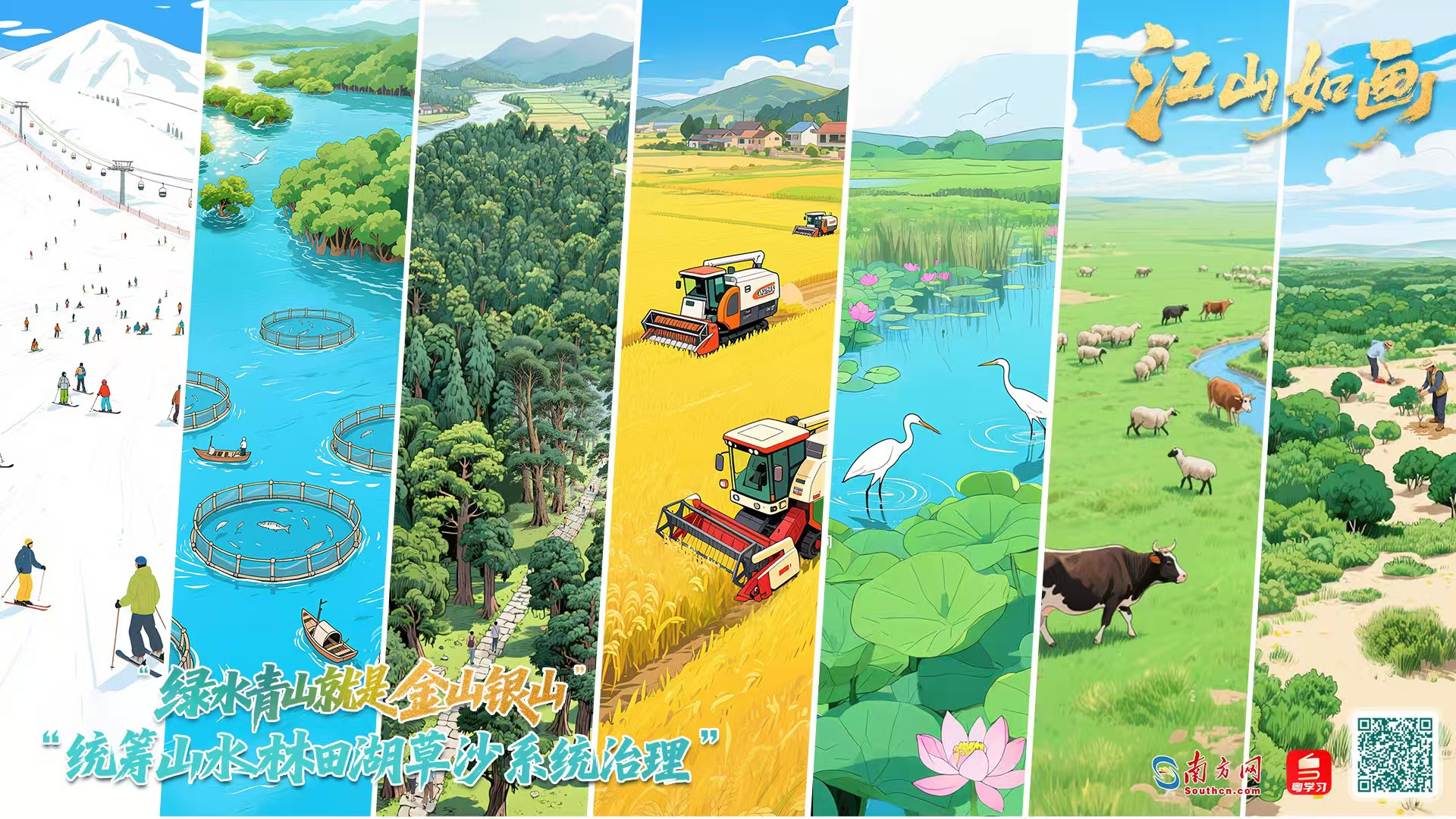 從20年前的余村到現(xiàn)在的中國(guó)大地,從“山水林田湖是一個(gè)生命共同體”到“統(tǒng)籌山水林田湖草沙系統(tǒng)治理”,從海拔0米的南海之濱到4000多米高的世界屋脊,幅員遼闊、高低起伏的中國(guó)大地上,綠色發(fā)展的藍(lán)圖漸次鋪展,美麗中國(guó)的畫卷逐筆繪就。