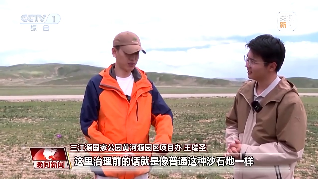 三江源國家公園黃河源園區項目干事 王瑞圣:這里治理前就像普通沙石地一樣,治理完的成效就是這樣子的,我們的草籽就在當時切割的凹槽里面生長,這些草籽好多根部已經進行分裂了,所以會顯得非常茂密。