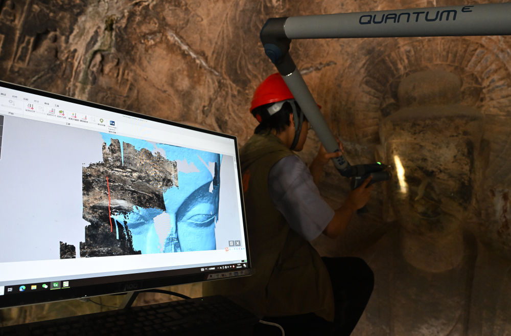2025年4月9日,武漢大學文化遺產智能計算實驗室團隊成員在河南洛陽龍門石窟魏字洞使用關節臂掃描儀對佛像進行數字化掃描。從2005年起,龍門石窟研究院開始為龍門石窟建立數字化檔案,借助激光掃描、高清攝影等技術手段收集文物數據,以數字的形式留存千年石刻群的風貌,致力于讓這一規模宏大、氣勢磅礴的石窟瑰寶“芳華永駐”。