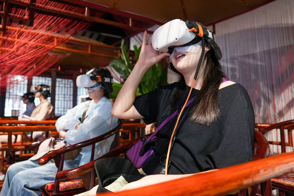 2025年5月18日,游客在江蘇蘇州拙政園體驗VR漫游。近年來,蘇州不斷推進“數字園林”建設,在園林整體數字建模、園林要素數據庫建設等方面開展探索,利用數字技術創造“數字云游”VR場景,打造“云游拙政園”“獅林園宇宙”“留園虛擬元宇宙”等項目,營造真實可感的虛擬空間,讓觀眾沉浸式感受蘇州園林的獨特魅力。