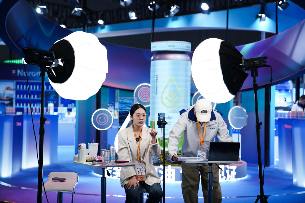 2025年11月4日,工作人員在第八屆進博會醫(yī)療器械及醫(yī)藥保健展區(qū)直播。本屆進博會直播密度大、形式多樣,有的展位專門搭建直播區(qū)域,燈光、背景、展板一應(yīng)俱全;有的展位手機一架、產(chǎn)品一擺,直播就地開始;還有的直播間是“流動的”,達人主播們拿著手機、別著麥克風(fēng),穿梭于各個品牌展位間現(xiàn)場推薦……八年來,進博會影響力逐年遞增,越來越多的中國消費者愿意通過直播了解進博會上的“全球好物”。