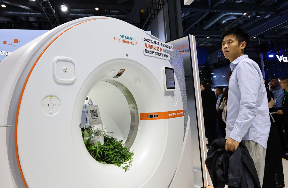 2025年11月6日,參觀者在第八屆進博會醫(yī)療器械及醫(yī)藥保健展區(qū)西門子醫(yī)療展臺駐足觀看一款亞洲首發(fā)首展的CT機展品。進博會是全球新品首發(fā)地,更被視為前沿技術(shù)“首秀地”。