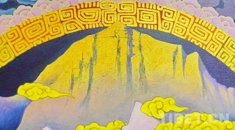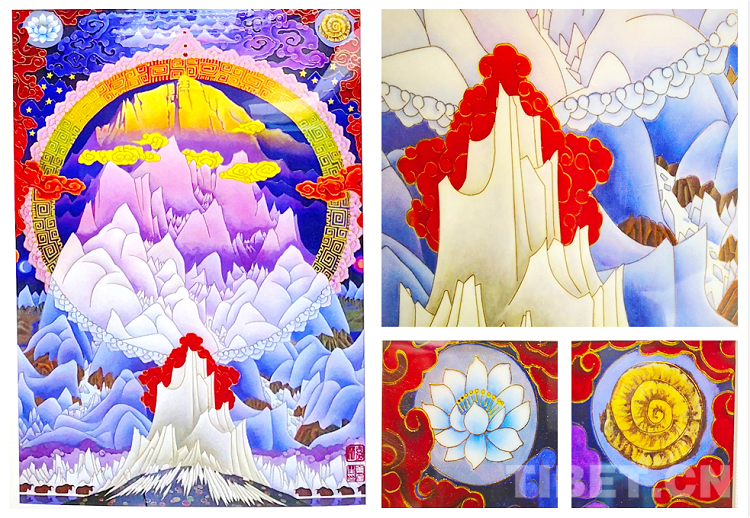 而令葉星生深受觸動的,是十世班禪大師對創(chuàng)作的關心、前衛(wèi)的創(chuàng)作思路和嚴格的要求。“十世班禪大師多次提出指導意見,鼓勵我們大膽創(chuàng)新,要融入光影等繪畫新技法及漢族傳統(tǒng)繪畫技法,使珠峰更有立體感,使畫作成為現(xiàn)代藝術技法與藏族傳統(tǒng)繪畫手法相融合的代表,成為民族團結的象征。所以,這幅畫在結構上參考了唐卡,比如彩虹;祥云、太陽、月亮、星斗對稱的方式等來自西藏傳統(tǒng)壁畫藝術;但在光線、明暗對比等方面加入了漢地工筆重彩,甚至西方的藝術手法。在天地之間以更加立體的視角展現(xiàn)出了珠峰壯麗雄偉的全景。”