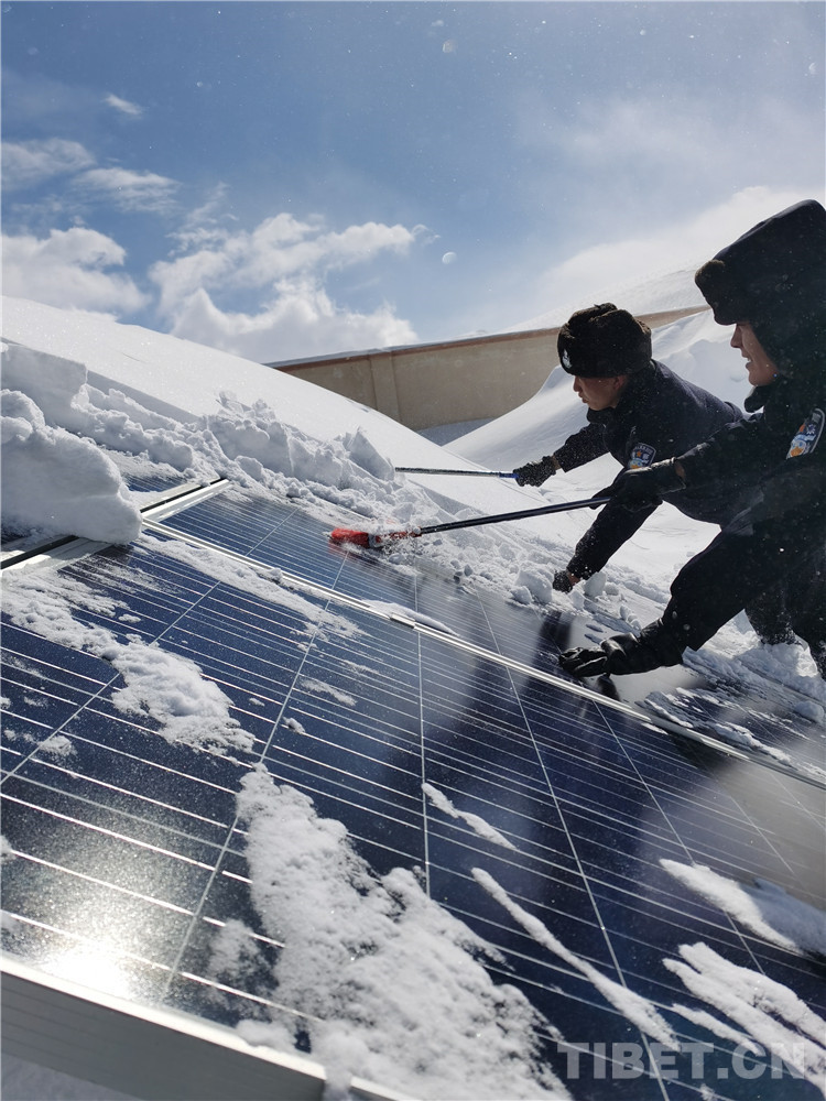 圖為民警們在2019年春節前遭遇暴雪時清理太陽能電池板上的積雪