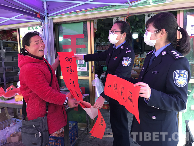 2月7日,拉薩邊檢站邀請拉薩市文聯書法家協會共同開展“同心同書——祖國新春好”送萬福進萬家活動。4名書法家揮毫潑墨,書寫漢文藏文春聯,散發著墨香的春聯凝聚著無限的祝福。隨后,邊檢站格?;ㄅ訄糖陉犆窬癁轳v地商戶送“?!彼痛郝?。在駐地的一家超市,商戶張大姐興高采烈地與民警一邊貼春聯,一邊笑著說:“感謝你們送來的新春祝福。今年雖然沒能回家過年,但有你們的陪伴照顧,我們感到很開心?!?/p>