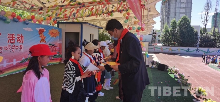 圖為西藏自治區拉薩市城關區納金小學“童心向黨、做時代新人”六一兒童節活動現場為優秀學生頒獎