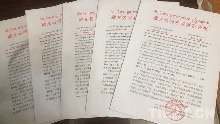 據介紹,在1987年西藏自治區藏語文工作委員會辦公室成立初期,成立了西藏自治區辭書審定領導小組,負責編纂審定漢藏對照行業詞典;1995年在全國藏語術語標準化委員會的領導下,西藏自治區藏語委辦和編譯局組織本單位專家和西藏日報、廣電、教材編譯等部門專家,定期不定期地收集審定出現頻率較高的新詞術語,并已活頁形式發布。