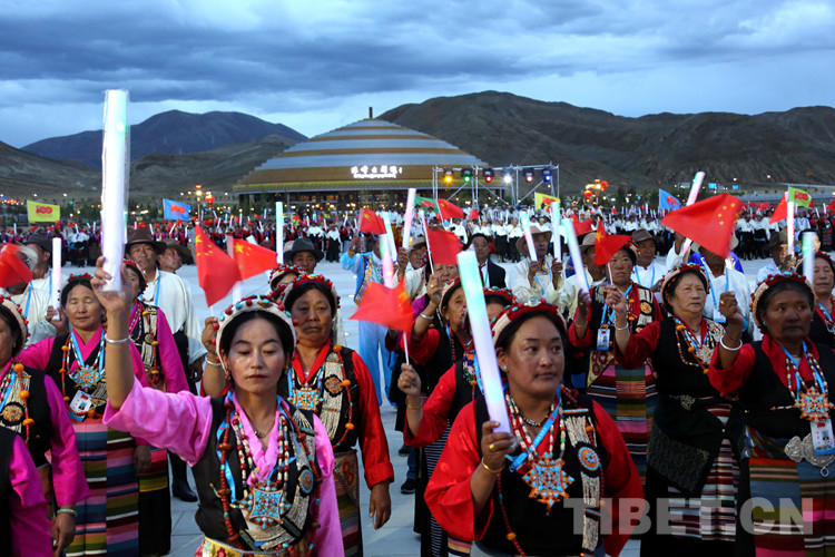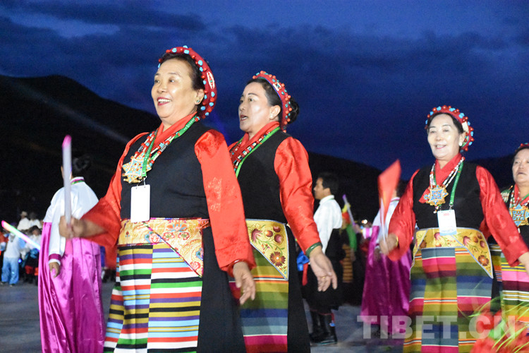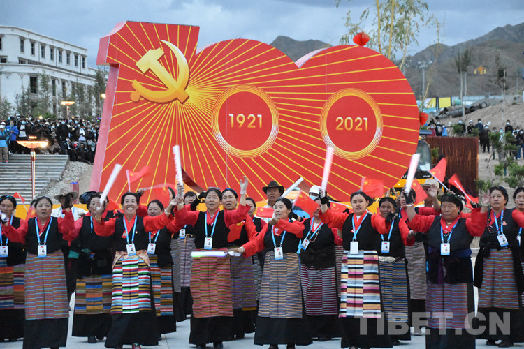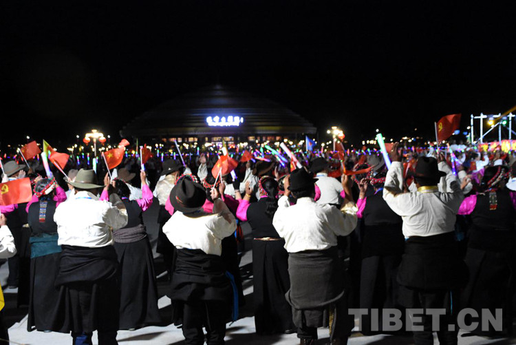 珠峰文創園區的聯歡活動分為三個章節,以《在燦爛的陽光下》《各族人民感恩黨》《西藏人民齊歡唱》三首歌曲作為開篇樂,來自日喀則各族各界的演員們,身著日喀則特色節日盛裝,在廣場中央,擺出數字“100”的造型,跳起歡快的鍋莊舞,在燈光的輝映下,造型美輪美奐。