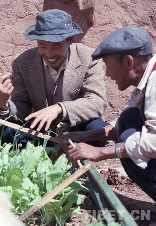 這是時任雙湖辦事處(現雙湖縣)紀律檢查委員會書記的熊亮兵(左),正在觀察自己在家門口通過搭塑料薄膜小篷試種的蔬菜(唐召明1987年攝)