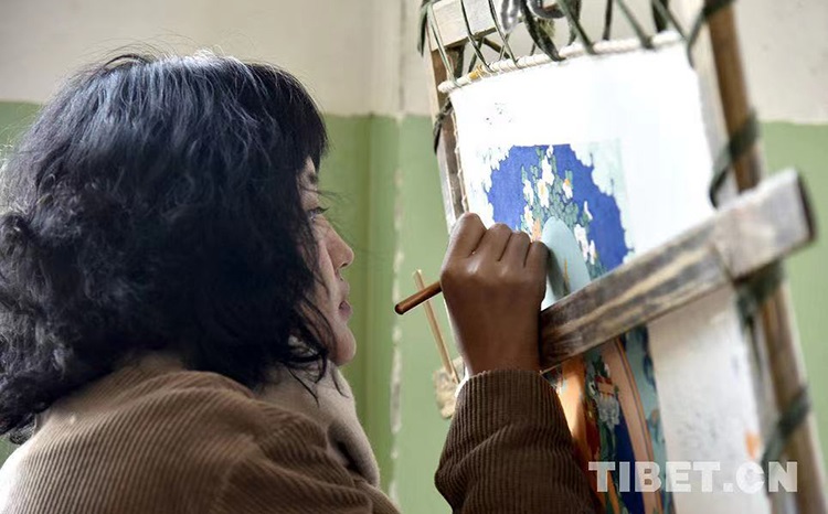 圖為西藏唐卡畫(huà)院學(xué)徒正在繪制唐卡