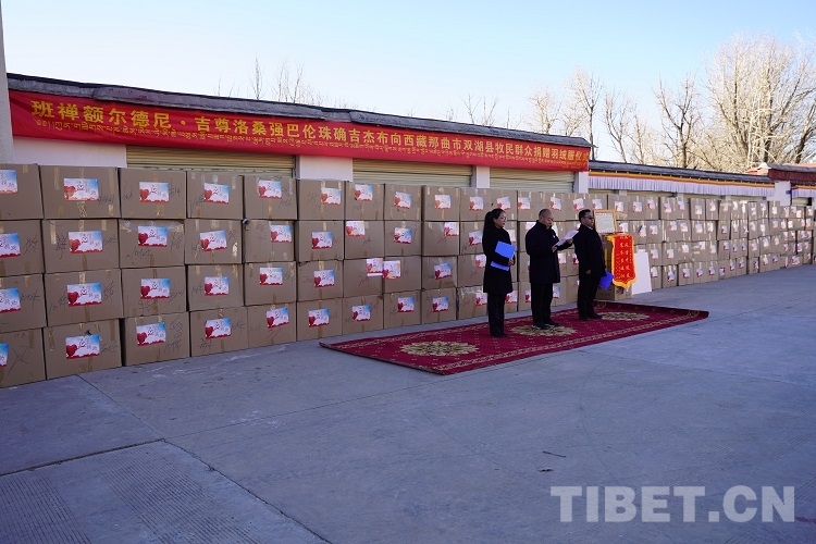 捐贈儀式上,雙湖縣副縣長普珍和農業農村局局長次仁達瓦代表雙湖縣縣委、縣政府和廣大基層牧民群眾接受捐贈并向班禪表示感謝。