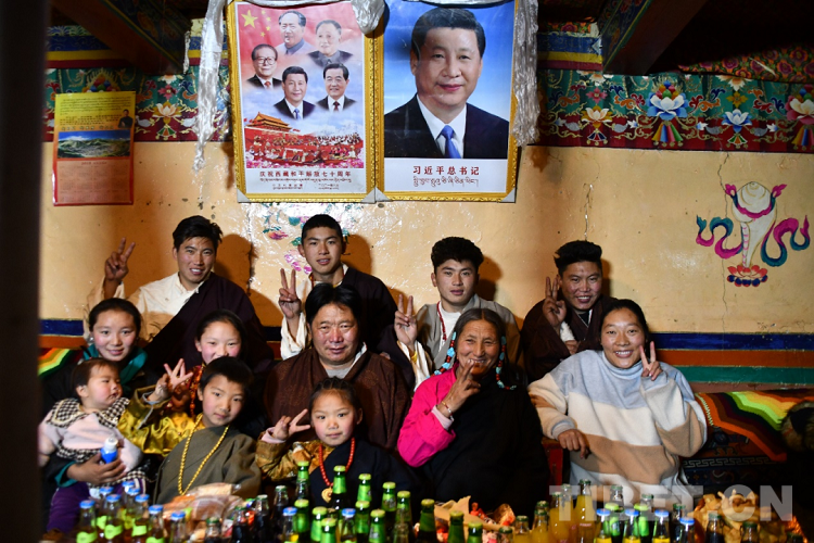 “尼瑪,拉姆,快過來獻(xiàn)哈達(dá)了!”索朗仁青一邊招呼著自己的孫子、孫女,一邊整理著手中的哈達(dá)。“向領(lǐng)袖獻(xiàn)哈達(dá)是我們家每年不變的傳統(tǒng),我們永遠(yuǎn)感謝偉大領(lǐng)袖,感謝共產(chǎn)黨。”索朗仁青一家莊嚴(yán)面向墻上懸掛的領(lǐng)袖像,高舉哈達(dá),齊聲祝福:“扎西德勒!”