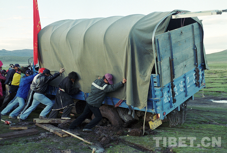 這是科考人員在奮力推出陷進藏北無人區沼澤地帶的科考卡車(唐召明2001年攝)