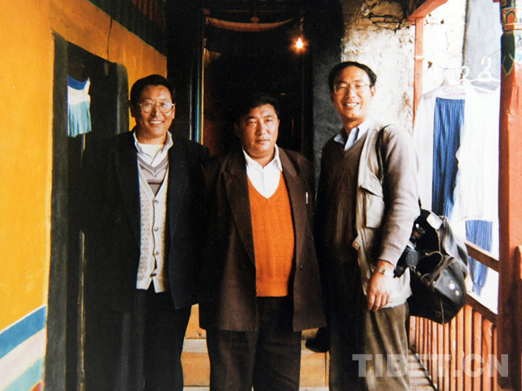 這是唐召明(右)與時任西藏自治區(qū)政協(xié)副主席、孝登寺寺主珠康活佛(中)在孝登寺合影留念(桑吉扎西1998年攝)