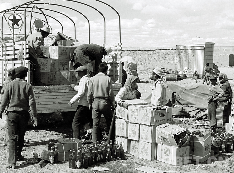 這是雙湖辦事處(現(xiàn)雙湖縣)貿(mào)易公司人員正在卸車,這些啤酒等食品飲料均由雙湖西亞爾公司組織貨源運輸而來(唐召明1987年攝)