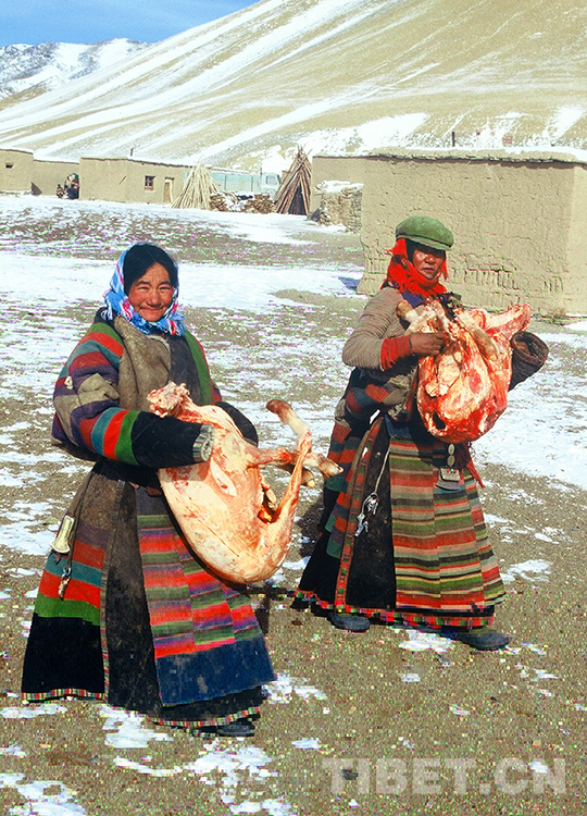 這是雙湖特別區(現雙湖縣)嘎措鄉一村兩位牧女從村里倉庫領到集體分配的羊肉回家(唐召明2001年攝)