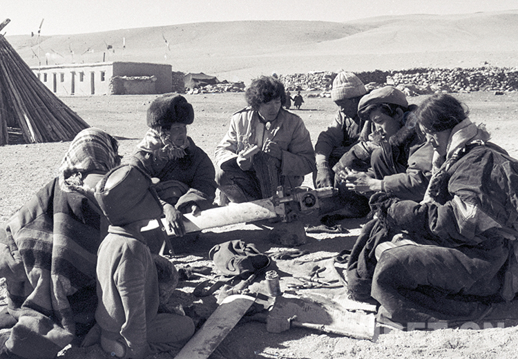 這是雙湖辦事處(現雙湖縣)嘎措鄉一村的一位牧女在為女兒縫制藏袍(唐召明1988年攝)