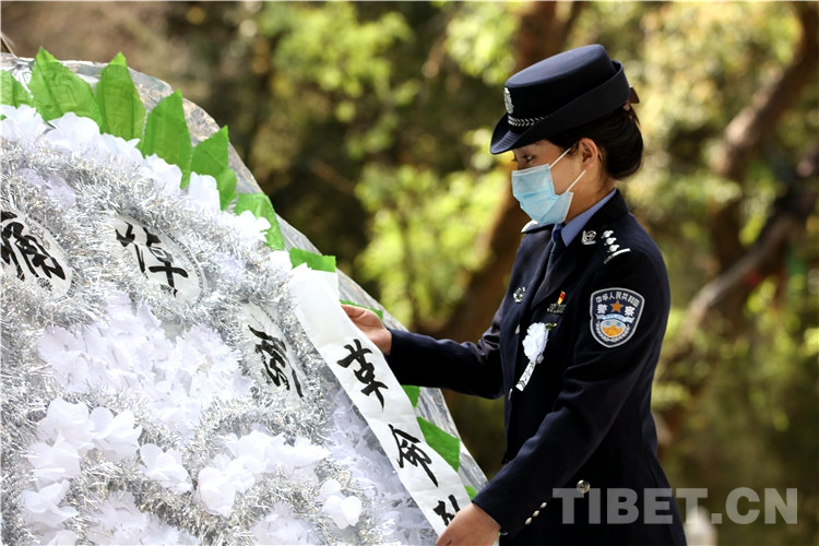 圖為民警為烈士敬獻花圈后整理挽聯 攝影:鄒興國