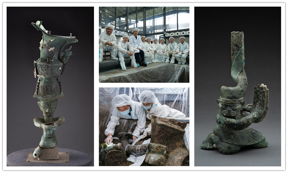 圖左為三星堆遺址三號坑出土銅頂尊跪坐人像;圖中上為部分發(fā)掘人員合影;圖中下為象牙保護(hù)與提取;圖右為三星堆遺址四號坑出土扭頭跪坐銅人像 圖片來源:國家文物局