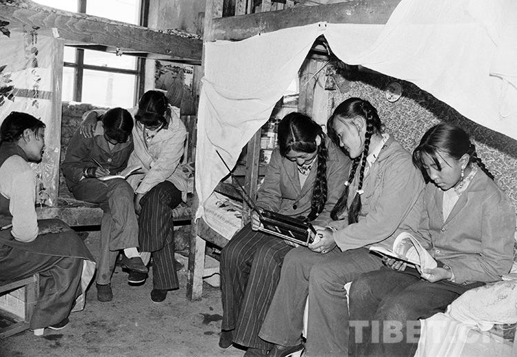 這是班戈縣中學寄宿女學生在宿舍里聽廣播和學習(唐召明1987年攝)